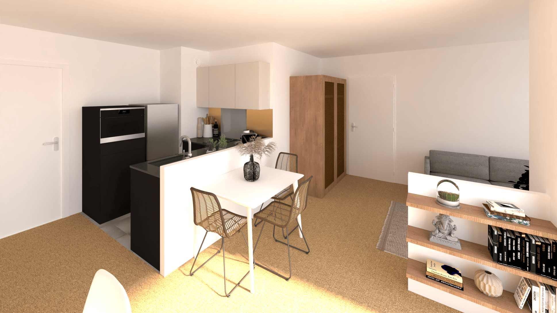 Pour ce projet situé à Saint-Cyr-l’Ecole, la cliente souhaitait surtout un accompagnement pour aménager sa cuisine, avec un léger travail de cloisons pour la chambre afin de créer un dégagement isolant l’accès à la salle de bain.