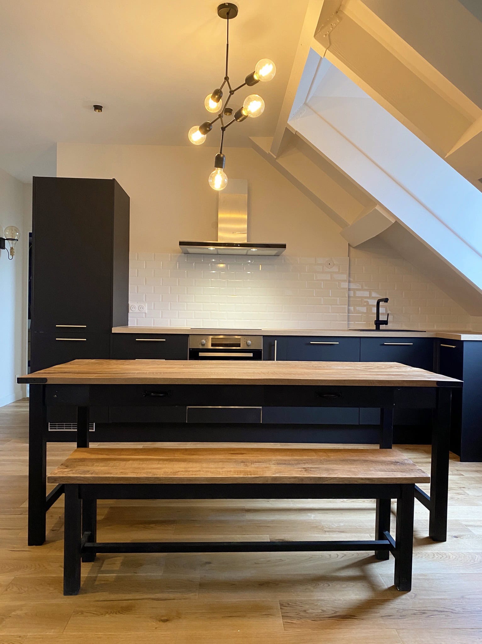 Pour la cuisine, la configuration précédente convenait mais plus les couleurs, intégrer les gros électro-ménagers dans les meubles pour plus d’homogénéité visuelle. Un salon simple et ouvert vers la cuisine pour ne pas interrompre les discussion et compartimenter l’espace.